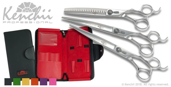 Dreamcatcher™ by Sue Zecco 8.0-inch straight and curved shears set with an 18-tooth blender. Includes animal-friendly KEL5Z faux leather five shear case with pockets for combs and tools.