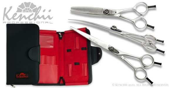 Set includes animal-friendly KEL5Z black faux leather 5-shear case ($35 MSRP), Level 2 molybdenum Five Star™ even handled 7.5″ straight shear, even handled 7.5″ curved shear, and even handled 38-tooth 6.0″ thinner.