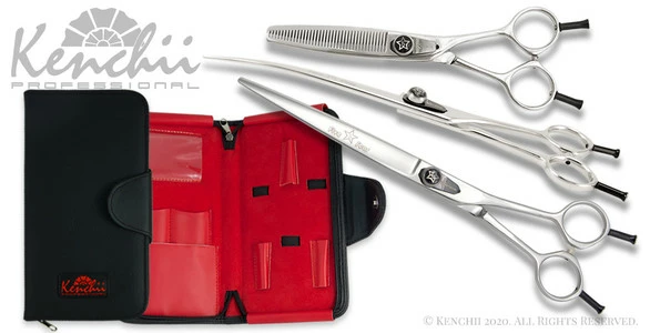 Set includes animal-friendly KEL5Z black faux leather 5-shear case ($35 MSRP), Level 2 molybdenum Five Star™ even handled 8.5″ straight shear, even handled 8.5″ curved shear, and even handled 38-tooth 6.0″ thinner.