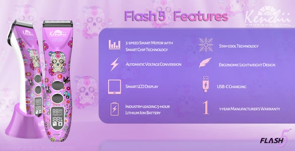 Kenchii Flash5™ Pet Grooming ClipperThe Kenchii Flash5™ Pet Grooming Clipper combines state-of-the-art performance technologies and elegant design. The Kenchii Flash5™ Clipper is paramount in its class. Coming in with 7,000 RPMs (on Speed 5), it is the fastest in its class! The 2023 Model Artwork (Purple Edition) make the Flash5™ Clipper one of the most elegant clippers available on the market today.