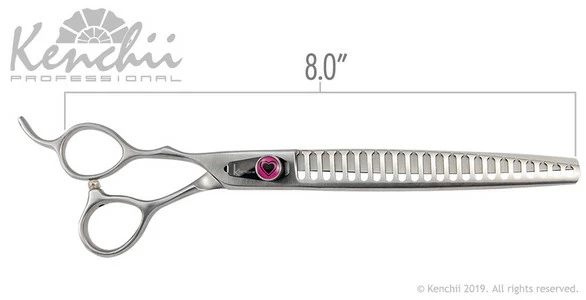 Kenchii’s top performance value grooming shears! Fully forged and hand-honed Japanese alloy steel with custom non-slip micro-serrated semi-convex edge. Love models are made with offset handles for comfort and finished with rustproof satin.