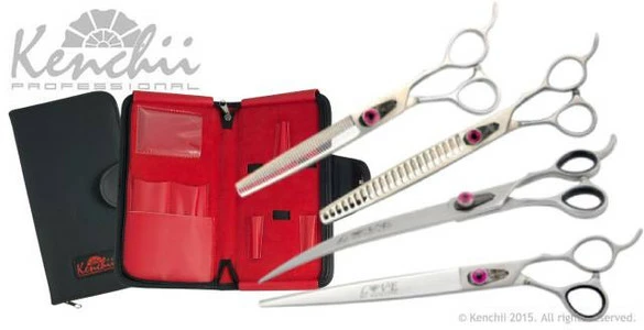 Kenchii’s top performance value grooming shears! Fully forged and hand-honed Japanese alloy steel with custom non-slip micro-serrated semi-convex edge. Love™ models are made with offset handles for comfort and finished with rustproof satin.