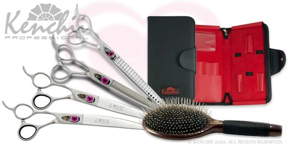 Set includes animal-friendly KELZ faux leather 5-shear case ($39 MSRP), Level 1 Love 8.0″ straight (Lefty), 8.0″ curve, 46-tooth thinner (Lefty), 22-tooth blender (Lefty), and large metal pin grooming brush.