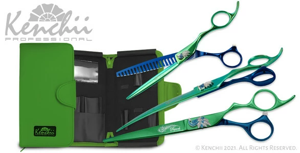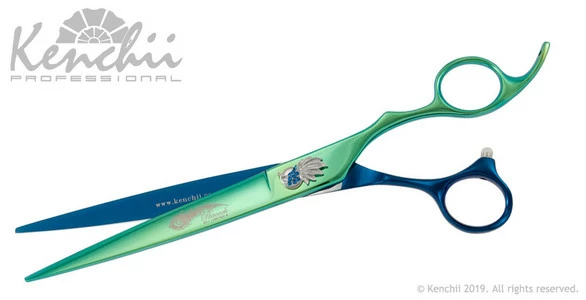 The Kenchii Peacock™ shear effortlessly cuts through even the coarsest of coats. The semi-convex edges are suitable for everyday grooming or finish work and the level 3 alloy ensures a long lasting sharp edge. The Peacock™ has a duotone blue and blue-green titanium finish and custom peacock assembly cap and blade markings.