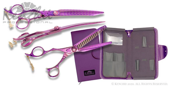 Set includes animal-friendly KEL5Z faux leather 5-shear case ($39 MSRP), Level 3 molybdenum Pink Poodle™ 8.0-inch straight shear, 8.0-inch curved shear, 18-tooth 7.0-inch thinner or 44-Tooth thinner.