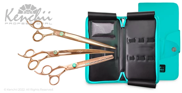 The Rosé set includes Rosé straight and curved shears, your choice of 25-tooth blender or 54-tooth thinner, and an animal-friendly faux leather 5-shear case.