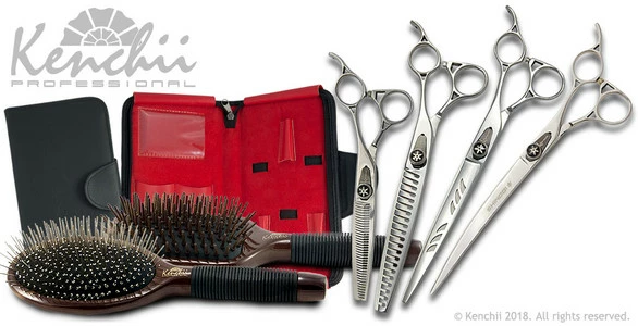 The Specialty Breed Poodle/Bichon Kit by Kenchii™ includes high performance tools carefully selected for the unique coats of Poodle and Bichon breeds. The semi-convex edges of the Shinobi™ shears, combined with the Shinobi™ thinner and blender, are ideal for finer coats. Use the metal pin brush to detangle and the wooden pin brush to smooth. The Poodle/Bichon kit by Kenchii™ provides all the tools you need to create a soft, seamless, and beautifully blended finish.