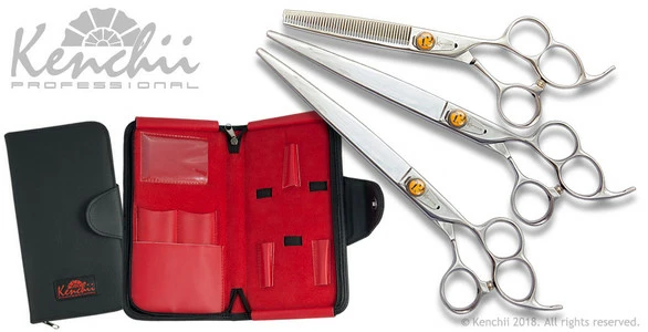 Set includes animal-friendly KEL5Z black faux leather 5-shear case ($35 MSRP), Level 2 molybdenum T3 8.0″ straight shear, 8.0″ curved shear, 46-tooth 6.5″ thinner.