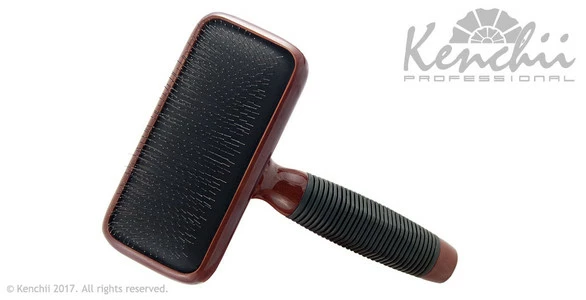 This high-quality brush is perfect for the home groomer or seasoned professional. Featuring finely-polished rounded pins, this brush is designed for undercoat removal and leaves the coat smooth and shiny. Kenchii Slicker Brushes are designed with a luxurious maplewood handle and a rubber non-slip grip to help provide control as you brush. The soft cushioned back pad also helps reduce brush burn for a fantastic finish to any grooming session!