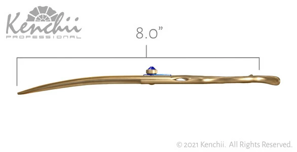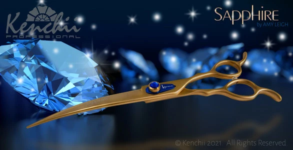 Kenchii’s latest in the Signature Series of shears. The Sapphire™ Line by Amy Leigh, has beautifully forged and hand-honed Japanese alloy steel with custom non-slip micro-serrated semi-convex edge. Sapphire™ models are made for comfort and finished with a satin brushed gold. The custom sapphire dial finishes the vibrant aesthetic of the of the Sapphire™ line. The curved shear in the Sapphire™ line provides greater versatility with an even handle.