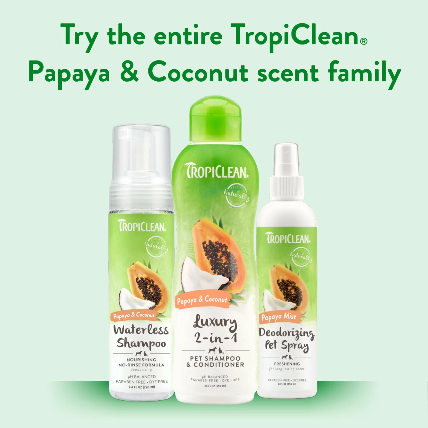 TropiClean Deodorizing Pet Spray conditions and soothes as it breaks down bad smells at their source, effectively refreshing your dog, cat, and home. The sweet and fruity scent of papaya leaves your pet smelling fresh and ready for cuddles!